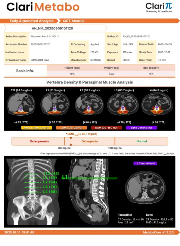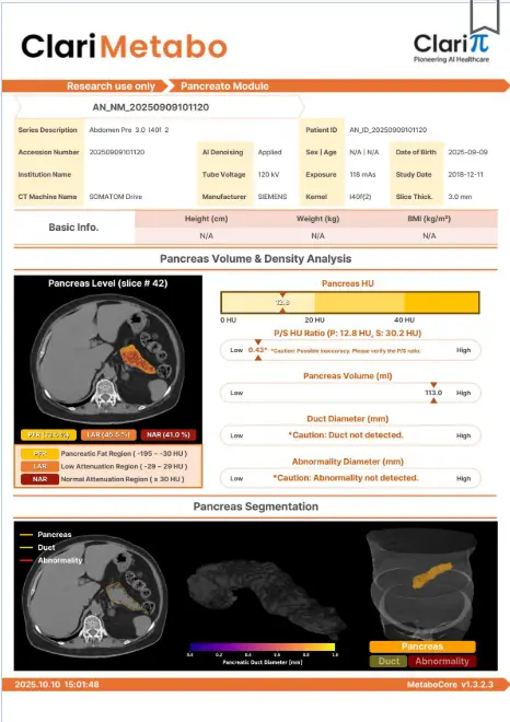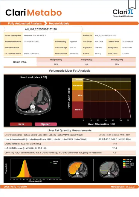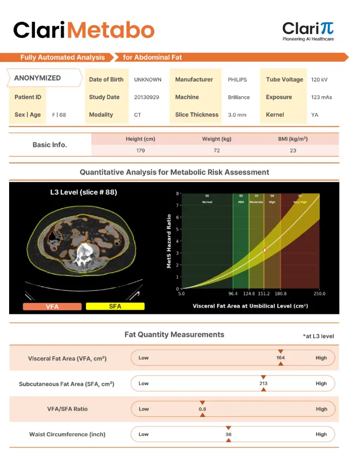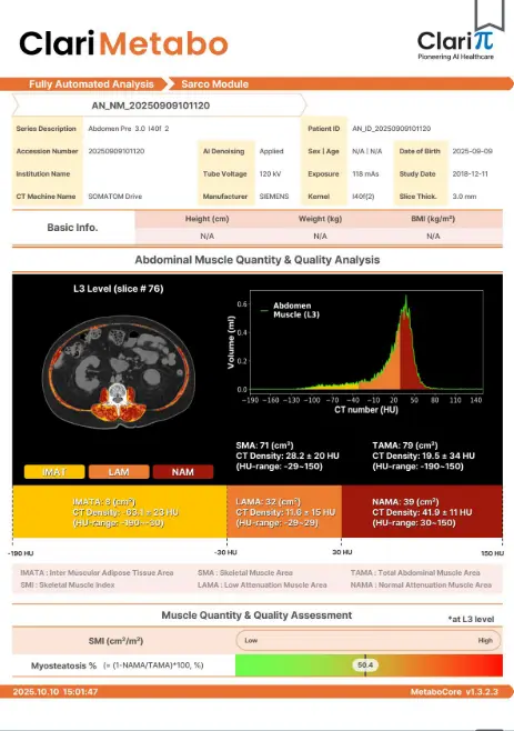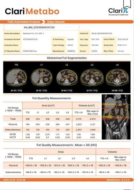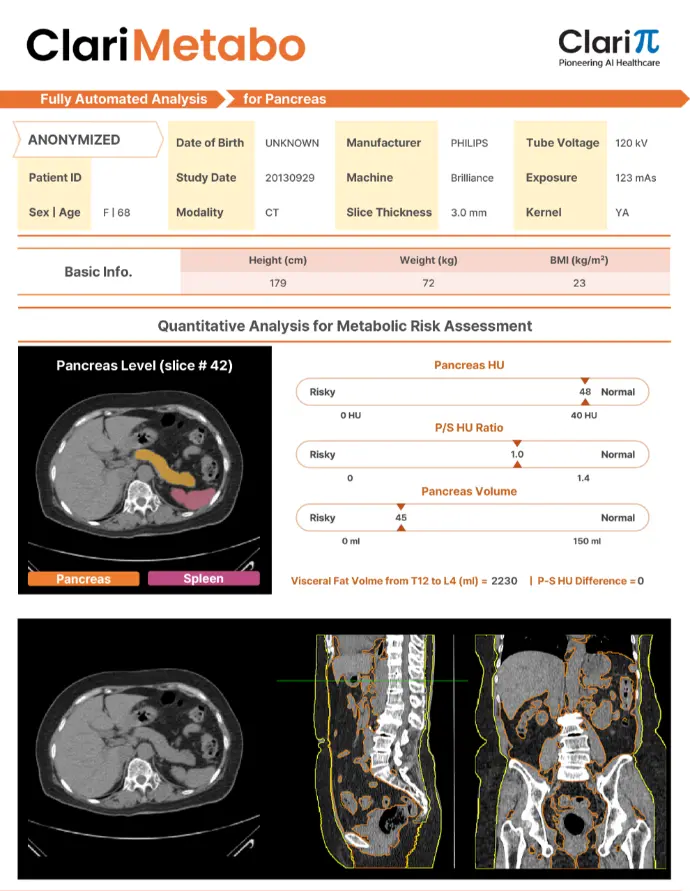 Transforme un TAC abdominal sin contraste en una visión completa del estado metabólico del paciente (músculo, grasa, hígado, páncreas y hueso) con análisis automáticos, cuantitativos y reproducibles.